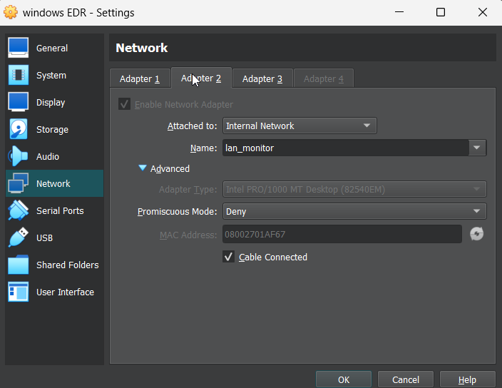 | Adapter 2 | Internal Network | Monitored traffic |