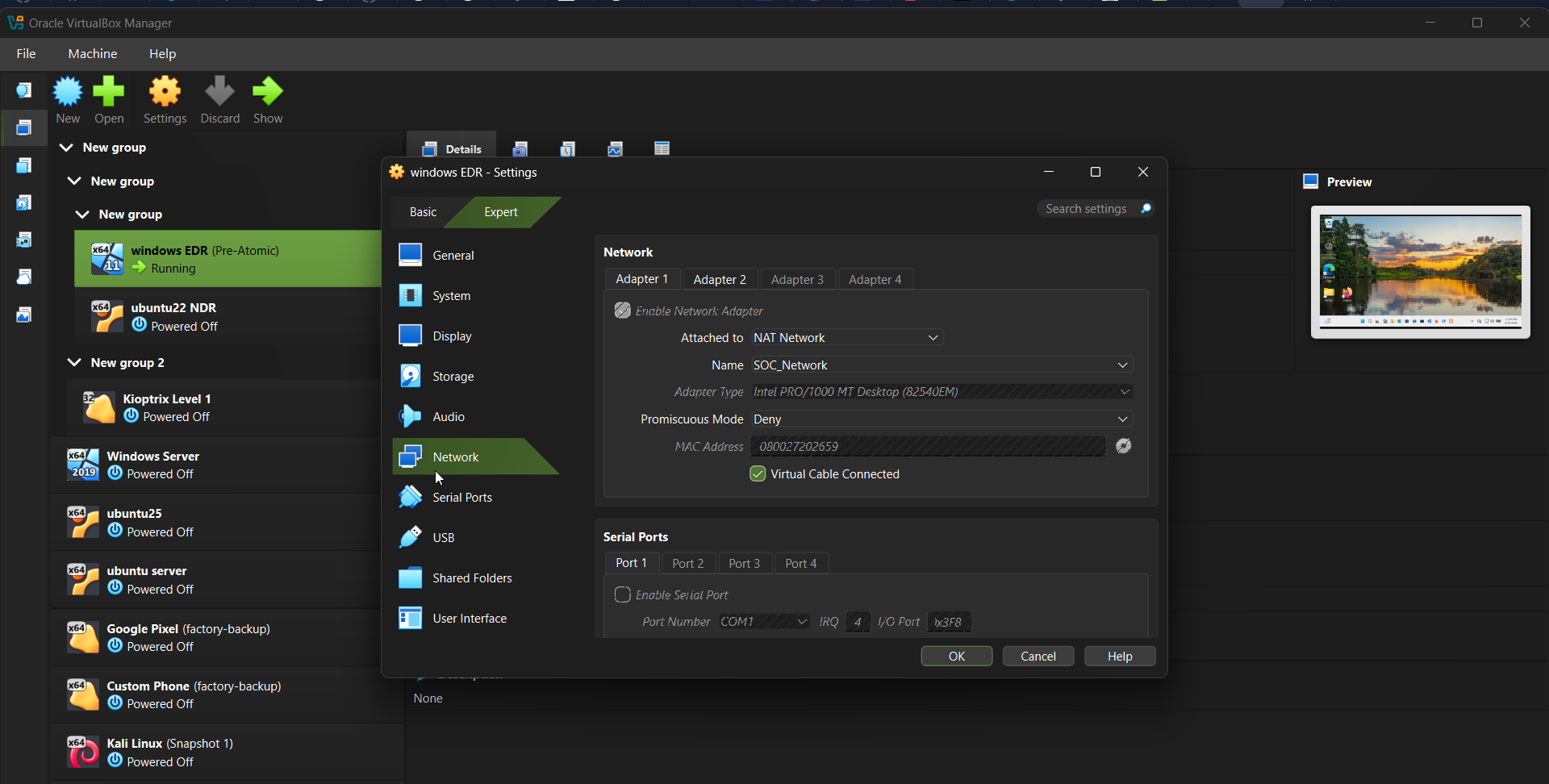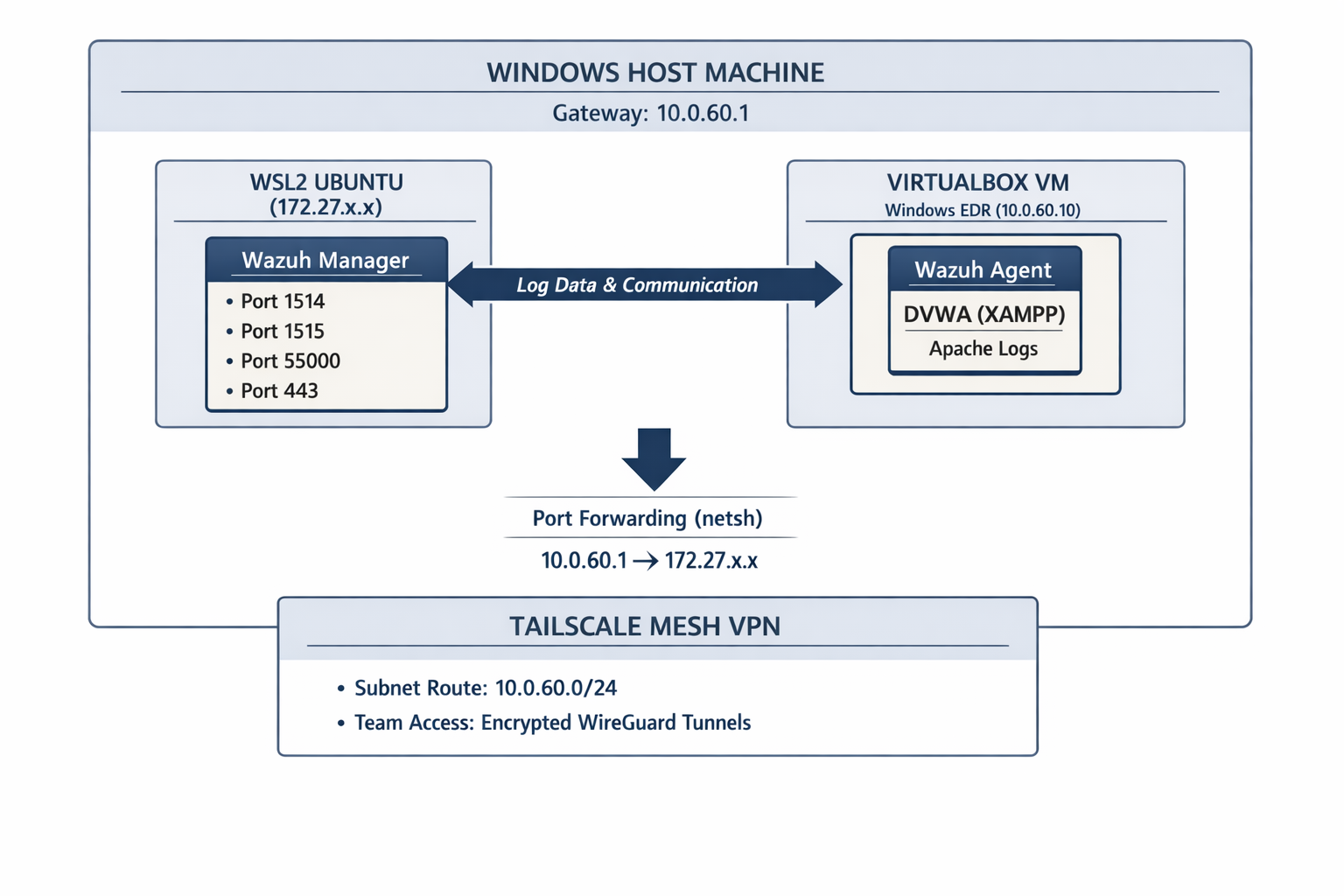 Layer 1 — Infrastructure (This post) VirtualBox provides the isolated network. The Windows host acts as a gateway. WSL2 hosts the Wazuh SIEM. Port forwarding bridges these otherwise disconnected networks.