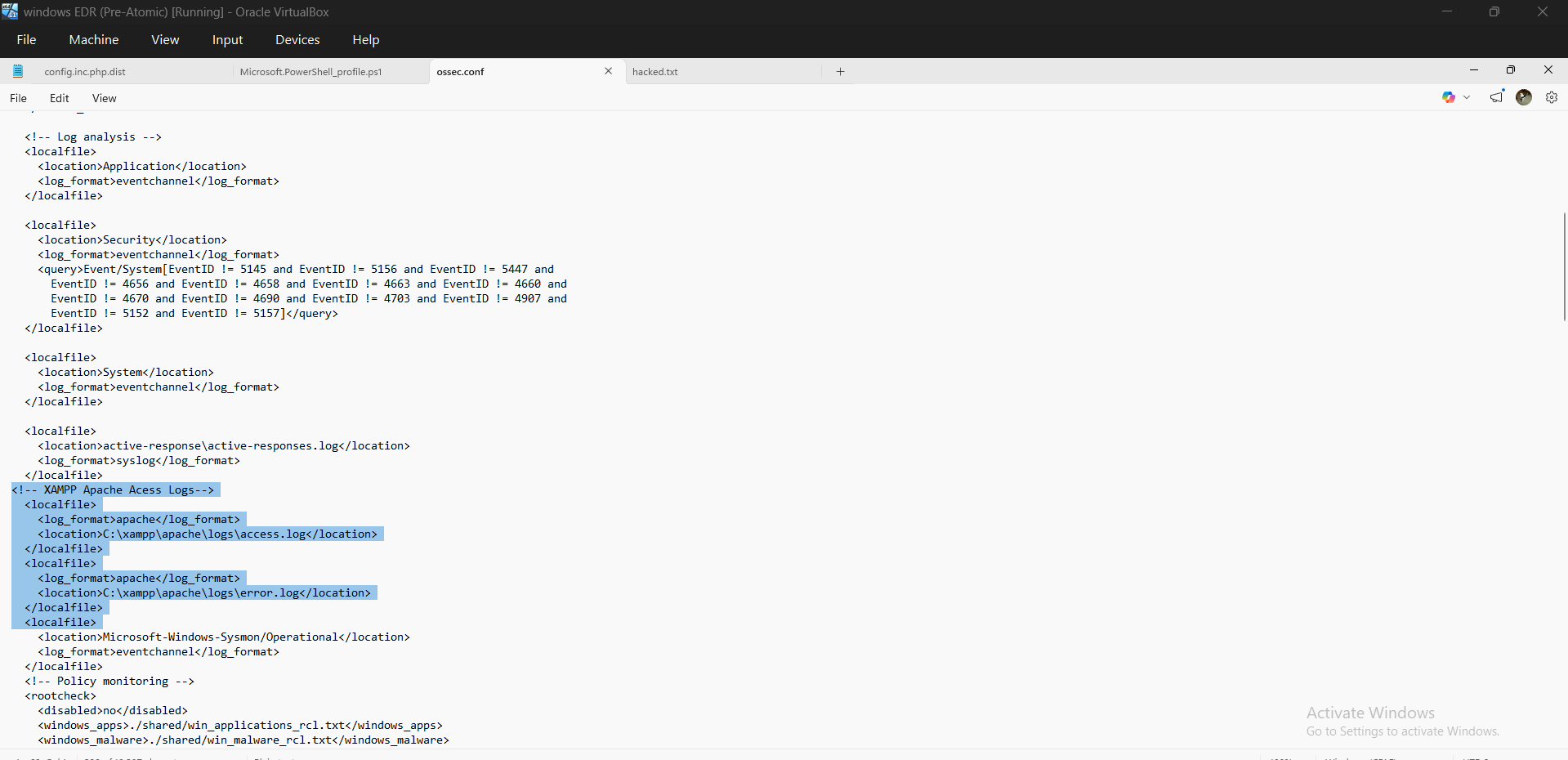 ossec.confdoesn’t match the actual XAMPP install directory - XAMPP logging is disabled in Apache’s