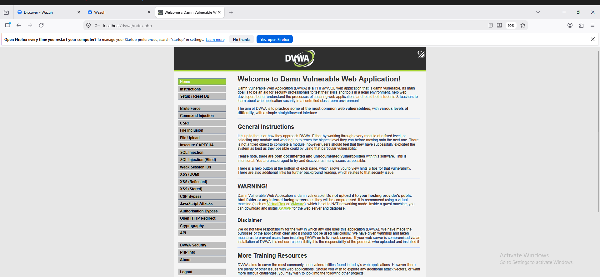 This VM is my attack surface — it runs DVWA and hosts the Wazuh agent.