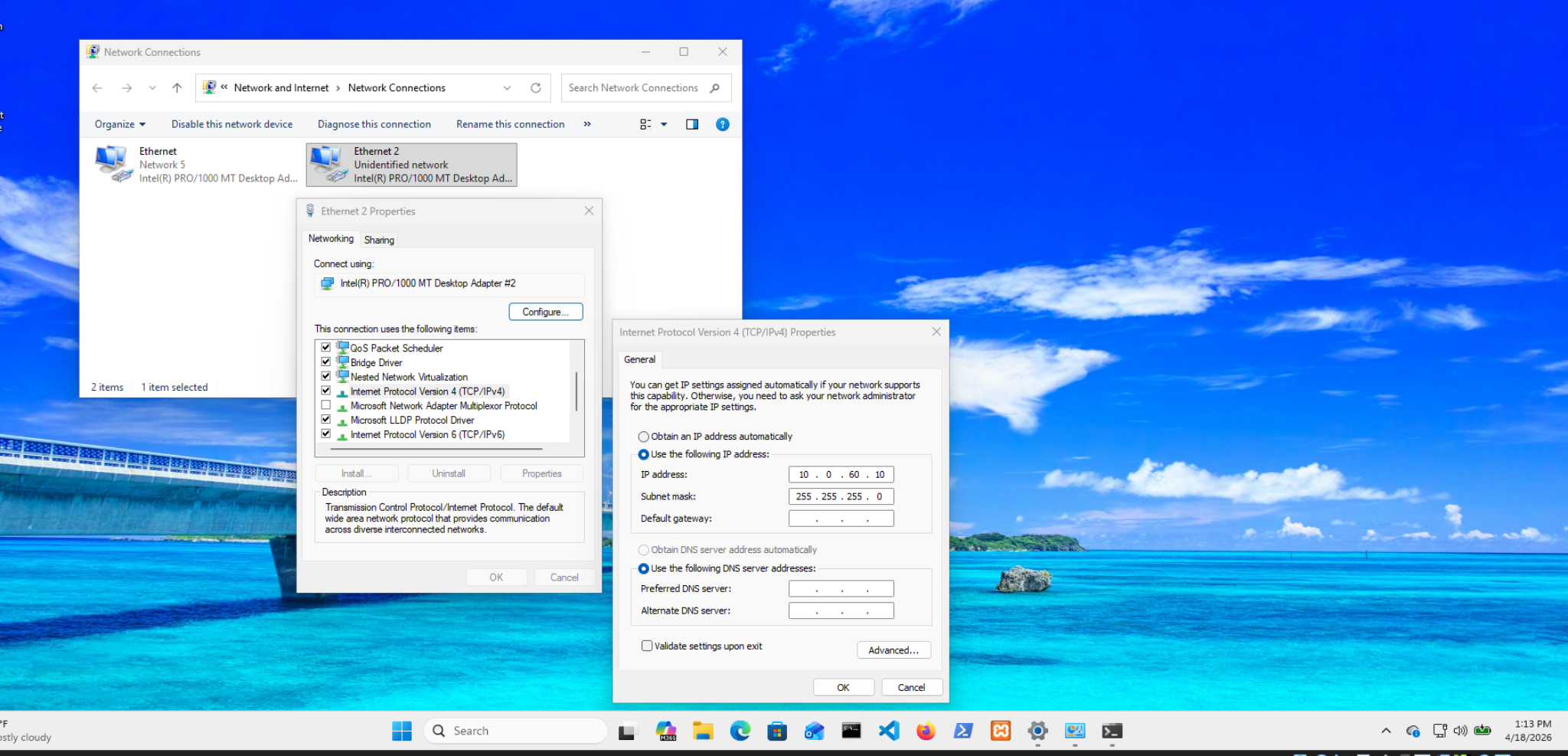 The Problem: The Windows VM had three network adapters (10.0.50.10, 192.168.100.10, 10.0.60.10) from previous configuration attempts. Windows was routing traffic out the wrong adapter, causing intermittent connectivity.