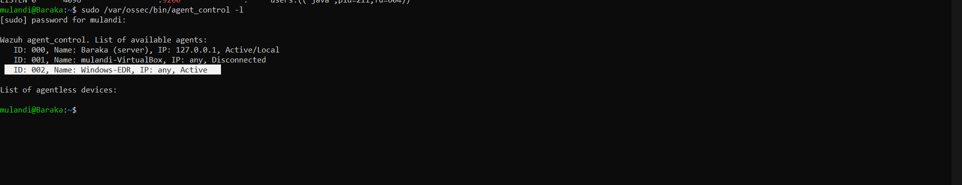 sudo /var/ossec/bin/agent_control -i 001